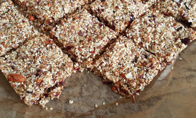 Nadat ik een aantal mueslirepen had gemaakt, werd het tijd voor iets nieuws; sesam repen! In de basis maak je je ze het zelfde als mueslirepen, alleen in plaats van havermout of ander soort vlokken gebruik je sesamzaadjes. Je kunt ze op verschillende manieren maken en je hoeft ze zelfs niet in de oven te doen. Maar door dat wel te doen worden ze lekker knapperig! Aanrader!