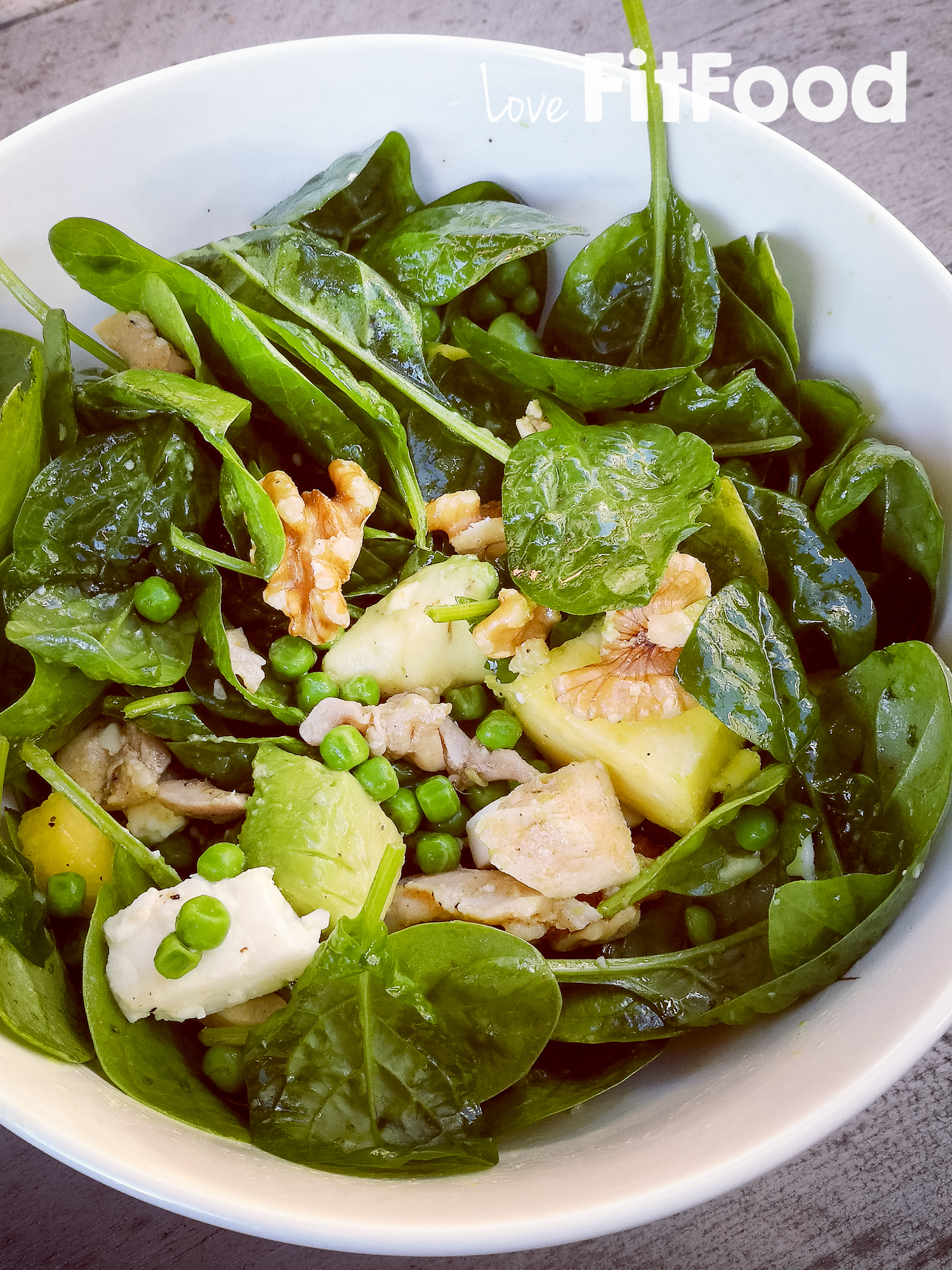 Een heerlijke simpele salade met kip, ananas, spinazie en walnoten. Je kunt eindeloos variƫren met de vulling, maak er de salade van die jij lekker vindt!