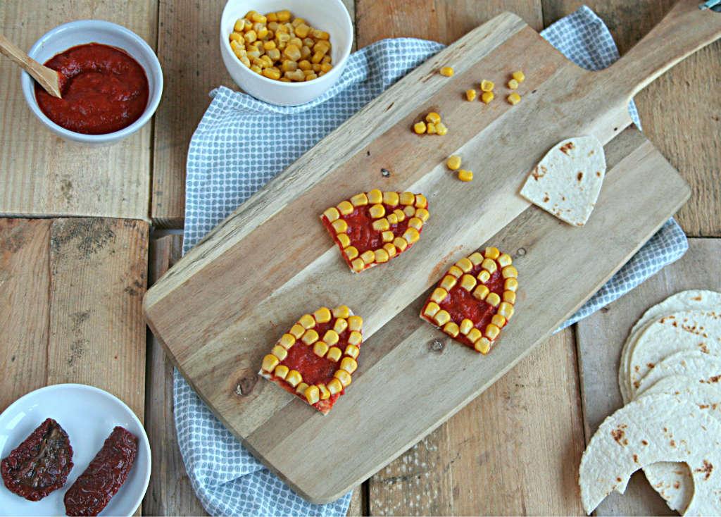 Na alle zoete Sinterklaas recepten is het tijd voor een gezondere snack. Even geen suikerhoudende ingrediënten, maar een gezonder tussendoortje met groente. Om de suikerspiegel enigszins in balans te houden kwam ik op het idee dit Sinterklaas hapje te maken: kleine Sinterklaas mijtertjes van wraps, tomatensaus en maïs.