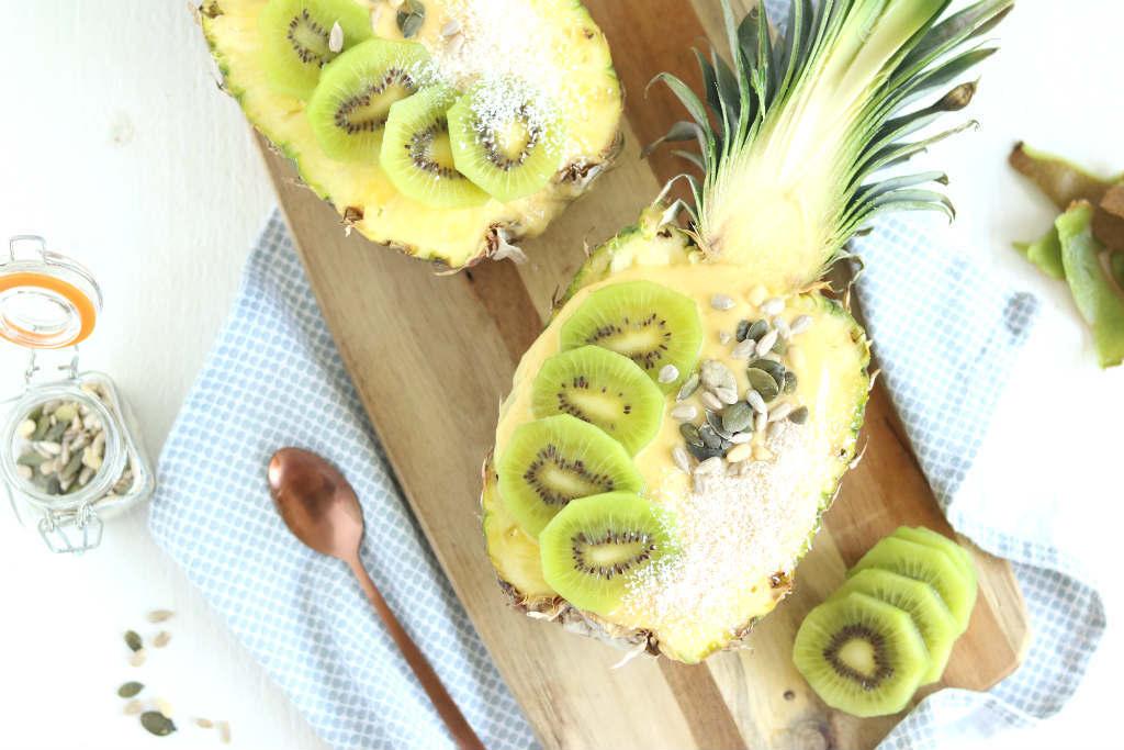 Het tropische sfeertje ontstaat al snel door de banaan, kokosmelk en mango. Een gouden combinatie. Qua topping ben je natuurlijk helemaal vrij om te kiezen. Zoals jullie weten heb ik graag nog iets te kauwen. Dus ik voeg nog wat stukjes fruit, kokos rasp (of vlokken) en een pitten mix toe. Maar dit kan ook havermout, gepofte quinoa, muesli zijn of waar je ook zin in hebt.