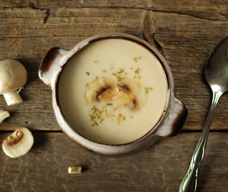 Schep ongeveer ⅓ van de champignons uit de pan en pureer de rest met een staafmixer. Roer de achtergehouden champignons en kookroom light erdoor. Laat de soep door en door warm worden. Breng de soep op smaak met peper en zout.
