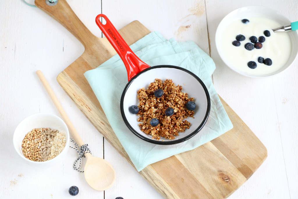 Granola rooster je normaal gesproken in de oven. Daar ben ik toch zeker wel een minuutje of 20 mee bezig. Deze granola is binnen 5 minuten klaar en er komt komt geen oven aan te pas. Ik laat jullie zien hoe je snelle granola uit de koekenpan maakt.