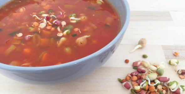 Deze tomatensoep met peulvruchten kiemen is super snel. Binnen 15 minuten staat je kop soep voor je neus, beloofd!