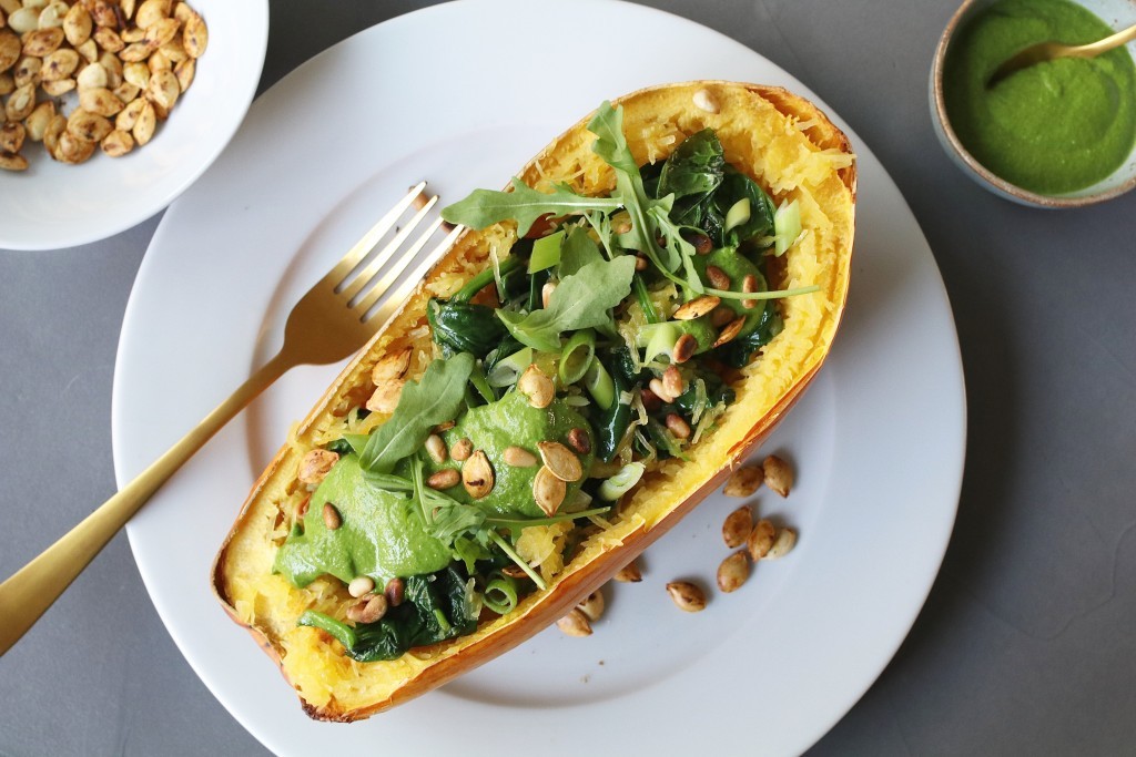 Spaghettipompoen, ik had er een week geleden nog nooit van gehoord. Het vruchtvlees van de pompoen zou je na een tijdje garen in de oven met een vork los kunnen schrapen met als resultaat spaghettislierten. Ik was er een beetje sceptisch over maar niets was minder waar! Al moet ik wel zeggen dat dit meer weg heeft van noodles, haha. Al met al is spaghettipompoen een mooi ingrediënt waarmee je een heerlijk én origineel gerecht kunt maken. Een makkelijk gerecht ook, want het is heel eenvoudig klaar te maken. Even de oven in, uitschrapen tot spaghetti en klaar is kees. Het vruchtvlees van deze pompoen is zacht zoet en smaakt top in combinatie met pittige rucola. Maak daarbij een lekkere homemade pesto van spinazie, rooster de pitjes uit de pompoen in een droge koekenpan met wat zeezout en eet smakelijk