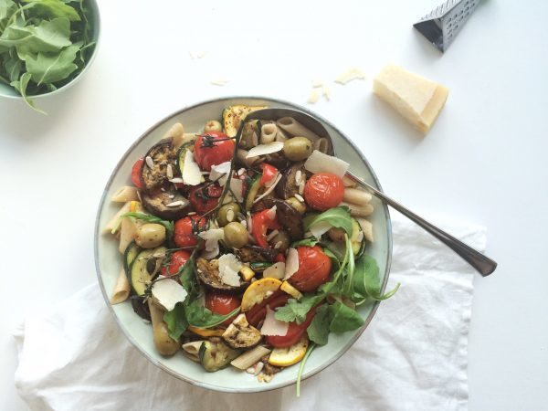 Deze salade is gemaakt van volkoren spelt pasta en zit vol met groenten! Door de groenten te grillen met kruiden, krijgt de salade veel smaak. De perfecte salade voor warme zomeravonden.