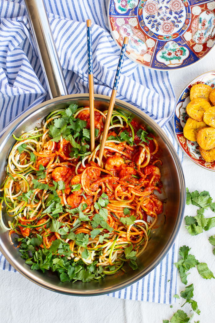 Ben jij ook zo’n fan van courgettenoodles? Ik ben er dol op, dat kan ik meerdere keren per week met alle plezier eten. Het is zo makkelijk te maken (met de spiraalsnijder!), en past perfect bij allerlei soorten sauzen. Nu ben ik vaak geneigd om er een standaard Italiaans gerecht mee te maken, dus deze keer besloot ik het anders te doen: ik maakte een pittige garnalencurry met bakbanaanchips erbij. Mijn man en ik hebben ervan zitten smullen, en het was ook nog binnen 20 minuten klaar!