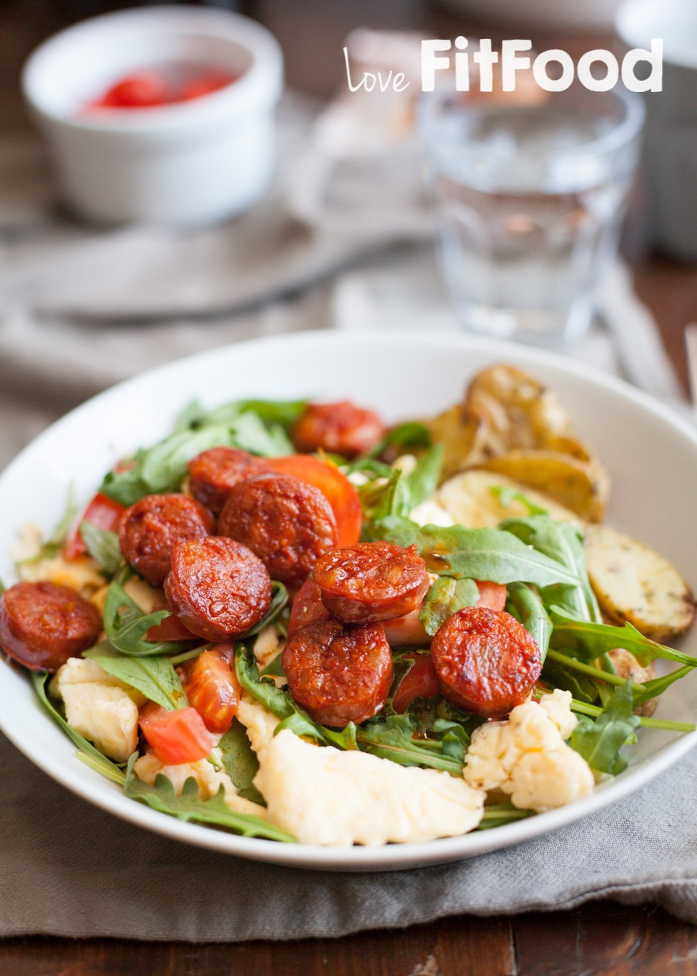 Maandag (*vervang door iedere willekeurige uitsteldag) starten met gezonder eten? Mooi, schuif maar aan tafel, je kan meteen beginnen. Dit volwaardige ontbijt bevat alle elementen voor een goede en gezonde start van je dag. Voor de foto combineerden we dit gerecht enkel met rucola als groente, maar je kunt dit ook nog verder aanvullen met komkommer of gooi er wat cherry tomaatjes doorheen. Super lekker! Het spicy is afkomstig van de stukje chorizo die we haalden bij de biologische slager. Helaas vonden we nog steeds geen goed alternatief bij de supermarkt, maar gelukkig hoeft (ook minder bewerkte) gedroogde worst niet meteen op.