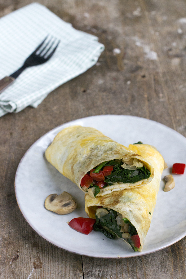 Vandaag deel ik een licht gerecht zonder koolhydraten. Al zou ik er voor de grote eters wel wat aardappeltjes of dergelijke bij serveren. Regelmatig eten wij gewokte spinazie, ik ben er dol op. Dit kan ik serieus iedere week wel eten. Vaak eten we het met gebakken aardappeltjes maar deze keer wilde ik er eens iets anders mee doen. Ei en spinazie zijn altijd goed samen en daarom rolde ik mijn mengsel met gewokte spinazie in een omelet.