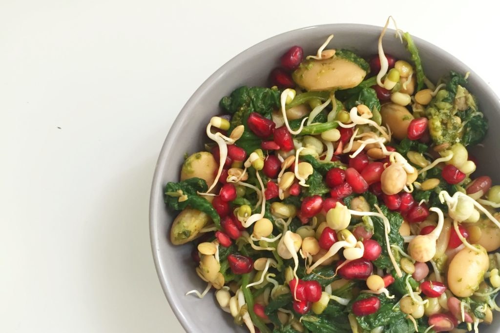 Ik krijg altijd gelijk honger van de geur van pesto! Wat jij? Combineer dat met spinazie, bonen en kiemen en je hebt een winner! Deze spinaziesalade is een heel fijn en licht gerechtje, plus gemakkelijk te maken. Supersimpel, lekker en healthy. Wat willen we nog meer in het leven?