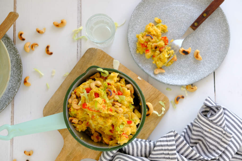 Stappen om een spitskool stamppot met cashewnoten te maken: