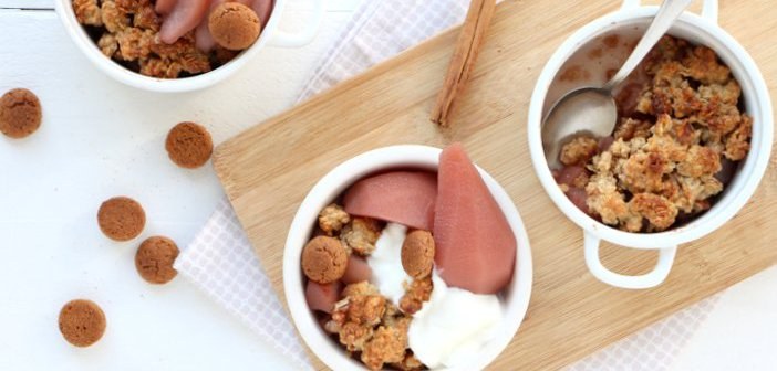 Om nou elke blog te beginnen met dat het wel duidelijk is dat de herfst is begonnen.... Nee, laat ik dat maar niet doen. Maar het is natuurlijk wel zo en tot nu toe heb ik er nog geen problemen mee hoor.... Behalve toen het vorige week een hele dag alleen maar regende. Oh echt, ik vind weinig dingen vervelend, maar van regen hou ik niet zo.... #understatement... Waar ik wel van hou, zijn heerlijke warme crumbles uit de oven, zoals deze stoofperen speculaas crumble die ik onlangs maakte.