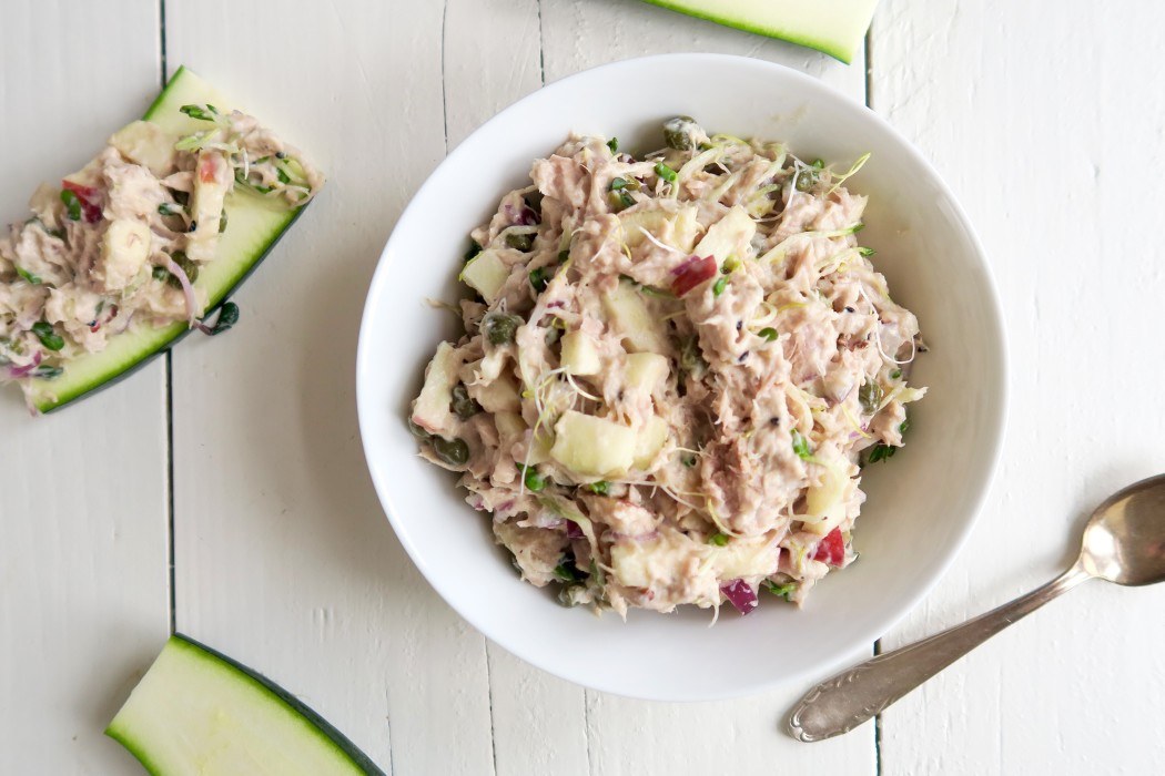 Deze tonijnsalade zit vol gezonde extra foodies bij als kiemen en appel. En kappertjes want die mogen natuurlijk niet ontbreken in een tonijnsalade. Smeer hem op crackers, dikke plakken courgette (dit is de extreem gezonde versie) of schep een flinke klodder op een groene salade. Lekker met gepofte tomaatjes!