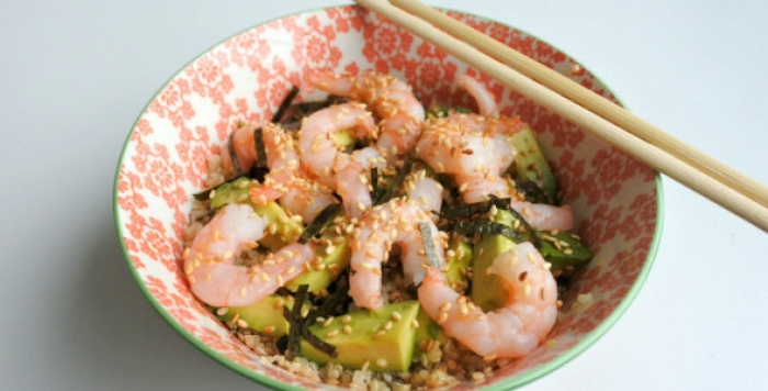 Deze sushi bowl met quinoa en garnalen is geïnspireerd op de sushi bowl uit het 5 or Less-kookboek van Chicks Love Food. Als, een tikkeltje luie, sushi liefhebsters vonden we dit namelijk een geniaal idee. Gewoon alle ingrediënten van sushi in een kom en klaar! Want dat rollen, aint nobody got time for that. We hebben er natuurlijk wel onze eigen twist aan gegeven. In plaats van witte rijst gebruikten we quiona en in plaats van surimi sticks mooie roze garnaaltjes. Maar het leuke aan dit concept is dat je er echt eindeloos mee kunt variëren! Wat dacht je bijvoorbeeld van zalmsnippers, tonijn en stukjes komkommer? Of serveer het met wat zeewiersalade of edamame boontjes. Heerlijk!