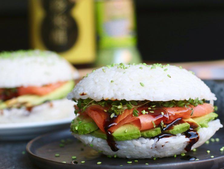 Sushi burger met gerookte zalm en unagi saus