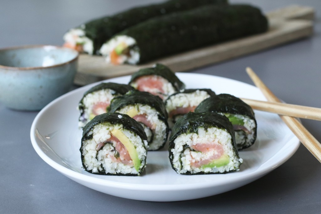 Ik vind het leuk om gerechten net even een tikkeltje gezonder maken door ingrediënten te vervangen door groenten. Ik probeerde vorige week de rijst waarmee je normaliter sushi maakt te vervangen door rijst van bloemkool en dat was echt zó lekker. Ik nam voor de verandering eens gerookte zalm in plaats van rauwe en mierikswortel in plaats van wasabi. Ik ging wel voor de gouwe ouwe combi zalm en avocado en alles bij elkaar resulteerde in een heerlijke portie zonder sushi.