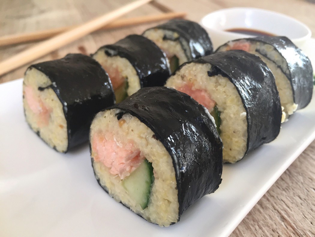 Potverdorie wat hou ik toch van sushi. Ik had al helemaal in mijn hoofd wat ik wilde eten, begint mijn vriendin over sushi en jaaa hoor. Sushi it is! Maar dan wel een beetje snel want er heerst hongeeer. Sushi rijst is helaas niet zo voedzaam dus koos ik voor gierst. Ik maakte een tijd geleden sushi van bulgur (wat primaaa werkte), maar gierst werkt nóg beter omdat het wat plakkeriger is.