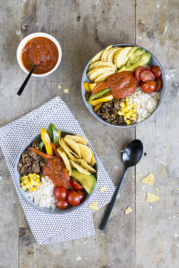 Dat lekker niet moeilijk hoeft te zijn bewijst dit recept. Alles wat je normaal in een taco zou stoppen zit nu in een kommetje, met daarbij lekkere nachochips. Ik ging voor een mengsel van rijst met gehakt en verschillende groenten. En het aller lekkerste is misschien wel de zelfgemaakte taco saus. Dit mag echt niet ontbreken hoor!