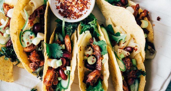 De pulled kip maak je ook lekker snel door eerst de kip aan te braden en daarna met een vork uit elkaar te trekken. Je maakt een lekker sausje met paprikapoeder en honing. Dan voeg je de kip toe en bakt de kip tot dat de honing gaat karameliseren. De kidneybonen toevoegen en, nu je toch bezig bent met die mandoline, de komkommer nog in mooie linten snijden. Vervolgens kun je alle ingrediënten in de taco’s doen en je hebt weer een super leuk en feestelijk gerecht!