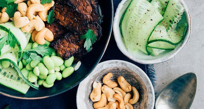 Qua toppings kan je van alles gebruiken, gewokte groentes zoals paksoi, peulen of spinazie, noten, rauwe paprika of reepjes wortel. Ik maak er een snelle zoetzure komkommer bij. Dat doe ik door de komkommer te besprenkelen met wat sushi azijn, dan heb je meteen die zoetzure smaak te pakken. Deze tip kreeg ik ooit van Robert Kranenborg en gebruik ik nu nog steeds. Ook lekker om schijfjes rode ui of deze manier in te maken. Ik ben benieuwd wat je van het recept vind, laat het vooral weten in de comments.