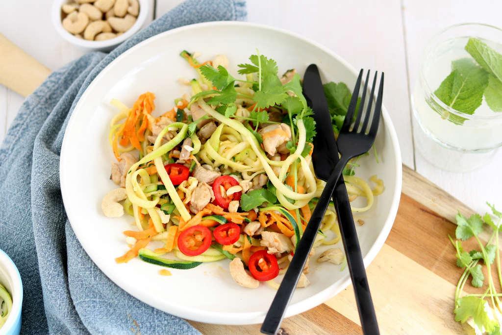 De kip heb ik op Thaise wijze gemarineerd. Het liefst gebruik ik hiervoor kip dijfilet. Dit is tegenwoordig goed te krijgen in de supermarkt. Dit stukje kip is wat vetter en daardoor blijft de kip lekker mals in de pan. Ik vind het daarnaast ook een goede tegenhanger voor de skinny courgette noedels. De Spaanse peper, koriander en cashewnoten zorgen dat dit gerecht een lekkere pittige bite krijgt.