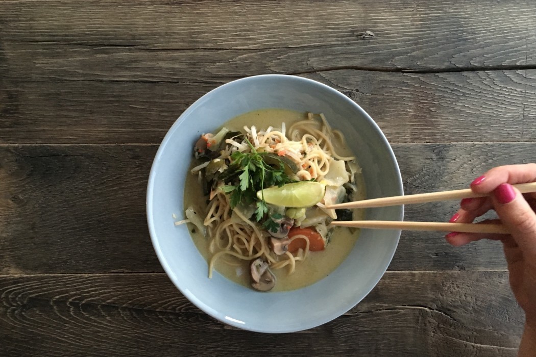 Oeh, Thaise Tom Kha soep is heerlijk! Die romige smaak van kokos en de pittige en wat zure smaak... We eten dat graag bij een eethuisje, bijvoorbeeld als voorafje. Maar de soep is zo lekker dat we er zelf ook graag een maaltijdsoep van maken. En of het nu hoort of niet, wij maakten onze eigen variant en voegden extra groenten en noedels toe. De soep is supersnel klaar, dus vanaf nu waan je je ook thuis in een mum van tijd in Thailand!