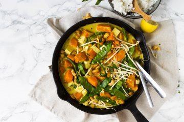 Je kunt zoals ik heb gedaan tofu én kikkererwten toevoegen of een van de twee. Ze bevatten namelijk beide eiwitten die er voor zorgen dat de curry vullend en voedzaam is. Serveer de curry met rijst.