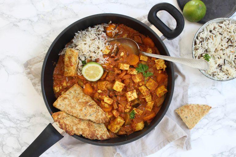 Een vegetarische tikka masala met tofu, groenten, rijst en naan dus!
