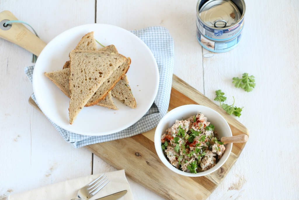 Een blikje tonijn is zo’n product dat altijd in mijn kast staat. De salade vul ik verder aan wat er in huis is. De tonijn maak ik aan met yoghurt of kwark. Zodra ik een feestje heb en er een hapje van maak, vervang ik de yoghurt door mayonaise voor een meer romige smaak. Het idee van vandaag is om een beetje op het lijf te letten.