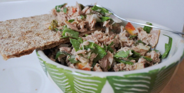 Als ik tonijnsalade voor me zie krijg ik op de een of andere manier spontaan trek. Ik zie het, en ik wil het gewoon helemaal opeten. Zijn er meer mensen die dit hebben? Nu ik de foto's weer aan het bekijken ben krijg ik er weer zin in. In het kort: ik hou van tonijnsalade. En wat is er lekkerder dan hem zelf maken? Het is makkelijk, lekker en heel gezond. Doe het op een cracker, rijstewater of op brood voor de lunch. Het appeltje geeft het een frisse smaak en een bite. Als je er een grotere salade van wil maken kun je gewoon wat extra spinazie toevoegen. Enjoy!