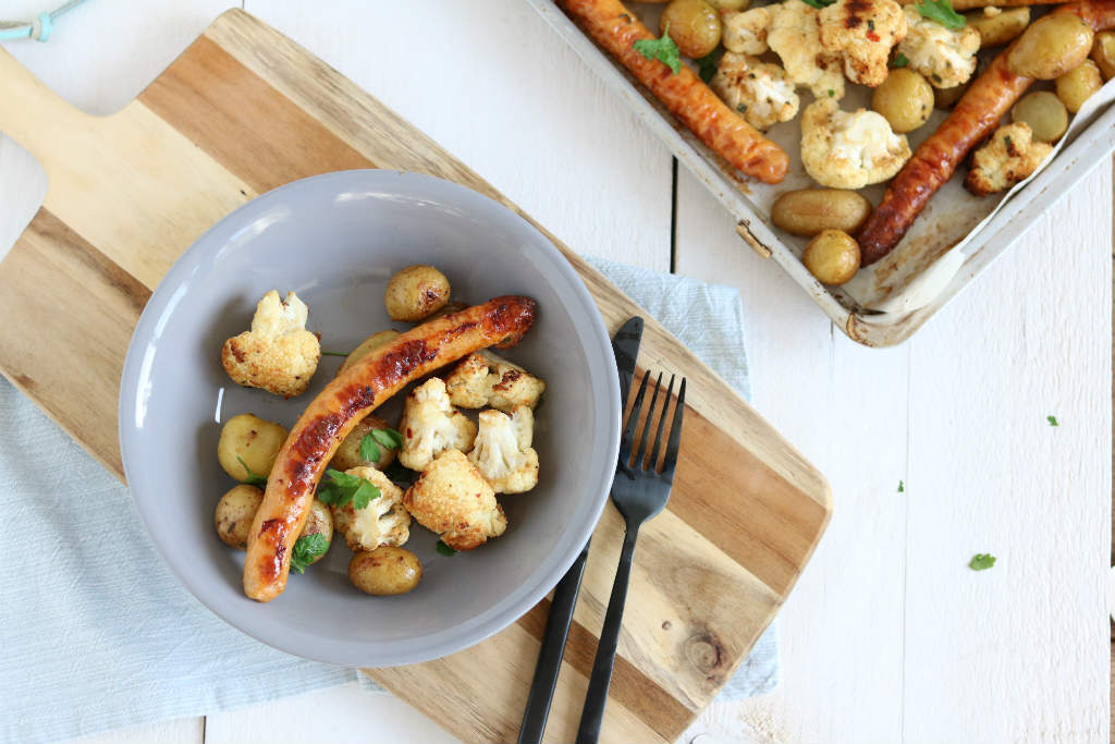 Zoals je waarschijnlijk weet ben ik niet zo dol op een standaard aardappel – groente – vlees maaltijd. Dit vind ik vaak een beetje saai en op het burgerlijke af. Een traybake maakt de Hollandse pot net even anders en veel lekkerder als je het mij vraagt. Je vult een bakplaat met ingrediënten en schuift de traybake de oven in. Na de herfst variant met pompoen is het nu tijd voor een traybake met bloemkool, krieltjes en worst.