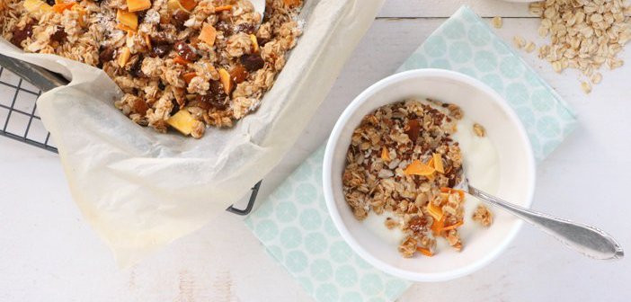 Ondanks dat het de laatste weken natuurlijk echt wel heel mooi zonnig winterweer is geweest, en ik zelfs al met mijn jas aan op het terras heb gezeten, kan ik me voorstellen dat je wel weer behoefte hebt aan iets hogere temperaturen. Ik ben net - geheel vrijwillig - nog even de kou ingedoken tijdens mijn skivakantie, maar nu is het ook wel mooi geweest. Laat die zon maar komen! Om zelf alvast maar wat initiatief te nemen, maakte ik een tropische havermout granola. De zonnestralen komen zo uit de oven!