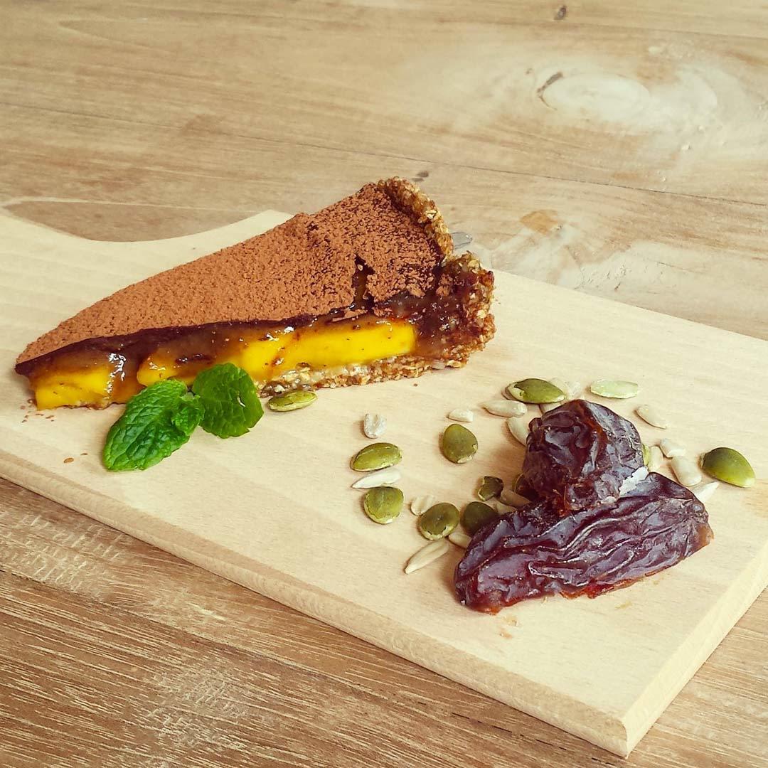 Ben je niet in het bezit van een oven, maar wil je toch een taart maken? Dan is dit ideaal om te serveren als toetje – of gewoon als tussendoortje bij de koffie natuurlijk. De bodem is lekker zoet en plakkerig door de medjool-dadels, die snoepjes uit de natuur zijn. Medjool-dadels zijn echte smaakmakers in de gezonde patisserie, ze zorgen gelijk voor structuur en ze kunnen een groot gedeelte van de suiker vervangen. En van minder suiker wordt je lijf blij! Door de tropische vulling krijg je het zomerse gevoel gelijk te pakken, dus gauw die keuken in om jezelf en anderen te verrassen met deze heerlijke smaakcombinatie. Heb je vragen of opmerkingen over het recept? Laat dan hieronder even een berichtje achter.