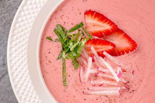 Soep en fruit lijken voor de meeste mensen nog steeds geen combinatie te zijn. Koude soepen zijn voor mij soms veredelde smoothies. Hoe je het ook bekijkt uiteindelijk draait het maar om één ding; Is het lekker? En girl oh girl wat kan ik hier van genieten! Zolang mijn trouwdag nog geen feit is, zit ik zolang in mijn bruidsjurk met ongeschoren benen thuis op de bank met een hijgende hond naast me. Met een zalig kommetje Koude Aardbeien Soep!