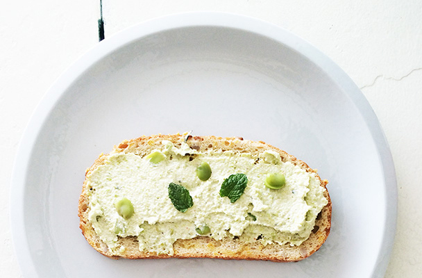 Eerlijk is eerlijk, het gebruik van verse tuinbonen in het gerecht maakt de bereiding van de spread een mindfull proces. De tuinbonen moet je namelijk doppen, vervolgens even kort koken en dan dubbel doppen (nog een keer uit het schilletje halen). Dat laatste hoeft niet perse maar het zorgt ervoor dat de boon minder taai wordt en voor mijn gevoel minder bitter. Je kunt voor het recept ook tuinbonen uit een potje gebruiken, maar ik vind het doppen wel iets gezelligs hebben waarbij ik moet opmerken dat het doppen voor een hoeveelheid spread voor tien personen een ander verhaal wordt...