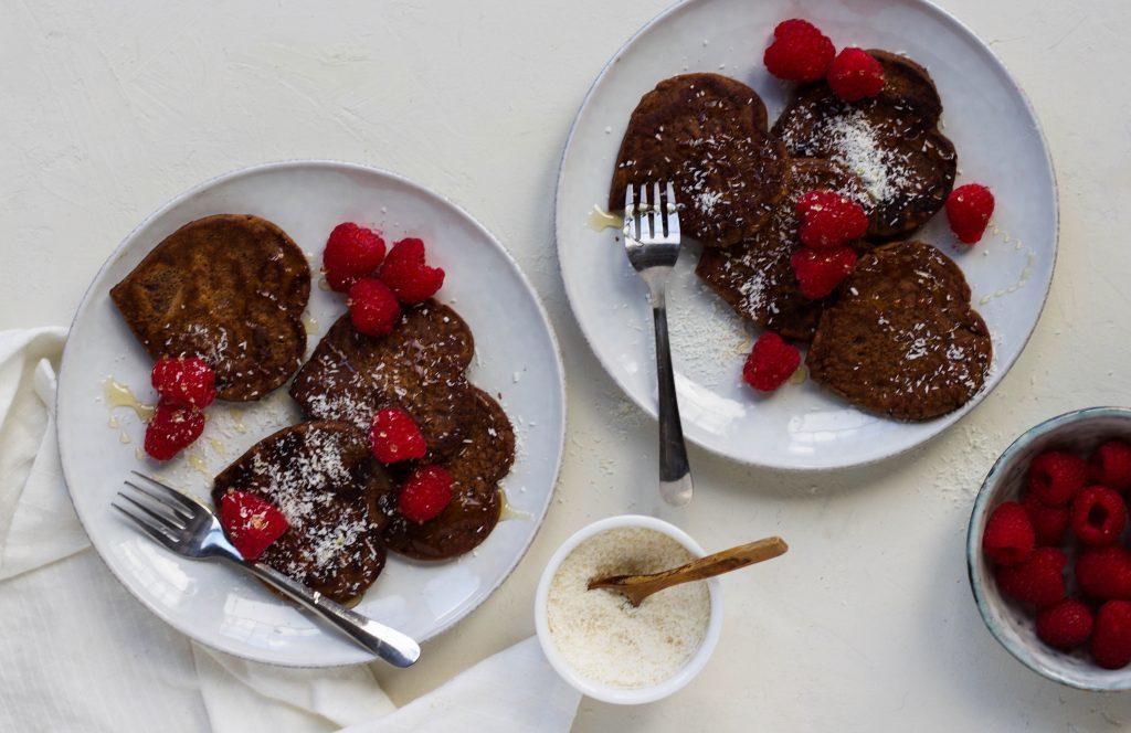 Frambozen en chocolade is zo een heerlijke combinatie! Ik besprenkelde de pannenkoekjes met rijstsiroop, maar dit kan natuurlijk ook met agave of honing.