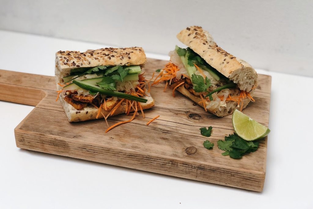 Banh Mi is een vietnamees broodje dat wordt belegd met vlees, verschillende soorten groente, kruiden en sriracha. Dit is een vega Banh Mi met tempeh en zuurkool. Klinkt als een gekke combi? Juist niet. Vaak wordt een Banh Mi broodje belegd met ingelegde groente, zoals wortel en komkommer. Dit geeft een lekkere, friszure smaak. In plaats van de komkommer en wortel inleggen, hebben we zuurkool toegevoegd. Natuurlijk kun je zoveel variƫren als je wilt. Liever wel vlees? Vervang de tempeh dan bijvoorbeeld door kip.