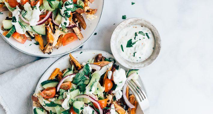 Tijdens het boodschappen bestellen zat ik het assortiment even door te spitten. Mijn oog viel op de vegetarische shoarma en die ging hup het mandje in. Alleen moest ik daar nog wel wat omheen bedenken. Het liefst iets gezonds, want het zou een doordeweekse maaltijd worden (en je kent mijn regime inmiddels wel). Dus zodoende kwam ik op het idee om een gezonde kapsalon te maken die ook nog vegetarisch is. Een echt foolproof recept, wat waarschijnlijk echt niet vergelijkbaar is met het origineel, maar wel heel lekker!