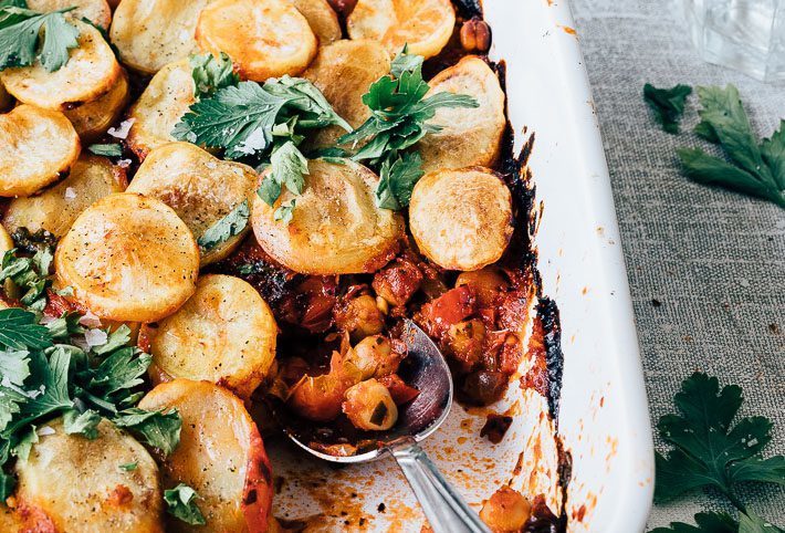 De vulling voor deze schotel maak je van tomaten, paprika en zongedroogde tomaat. Lekker met gedroogde Italiaanse kruiden en gemengd met kikkererwten. Het mengsel is ook heel lekker tussen een wrap of op toast. Of zo met een flinke eetlepel yoghurt. Voor de topping heb ik kant-en-klaar gesneden aardappelschijfjes gebruikt. Lekker makkelijk. Maar je kunt natuurlijk ook eerst aardappels koken en daarna in plakjes snijden. Vul een ovenschaal met het kikkererwten mengsel en leg de plakjes aardappel er boven op. Hup in de oven en het is klaar. Serveer met een lekkere groene salade.