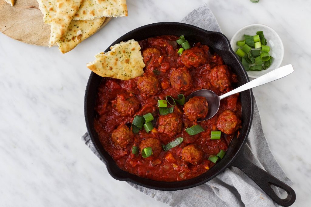 Tomatensaus, mediterrane kruiden, balletjes en klaar is pan comfort food. Je kunt er ook nog groenten aan toevoegen, zoals kleine blokjes aubergine of paprika. Heerlijk bij pasta, rijst, brood of serveer bij de borrel.