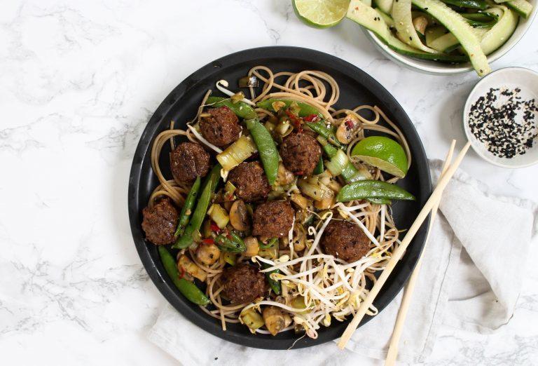Volgens mij is het recept officieel met noedels of mie, maar je kunt gebruiken wat je er zelf lekker bij vindt. Ik koos voor volkoren spaghetti, omdat ik dat nog had liggen, maar met soba noedels lijkt mij ook heel lekker.