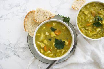 Om de basis van de soep vegetarisch te maken, gebruik ik groentebouillon. De vette rookworst en spekjes laat je gewoon lekker weg. Hiervoor heb ik in de plaats blokjes tofu gebruikt, zodat je wel die lekkere bite hebt. Wil je toch wel die rookworst smaak? Gebruik dan vegetarische rookworst.
