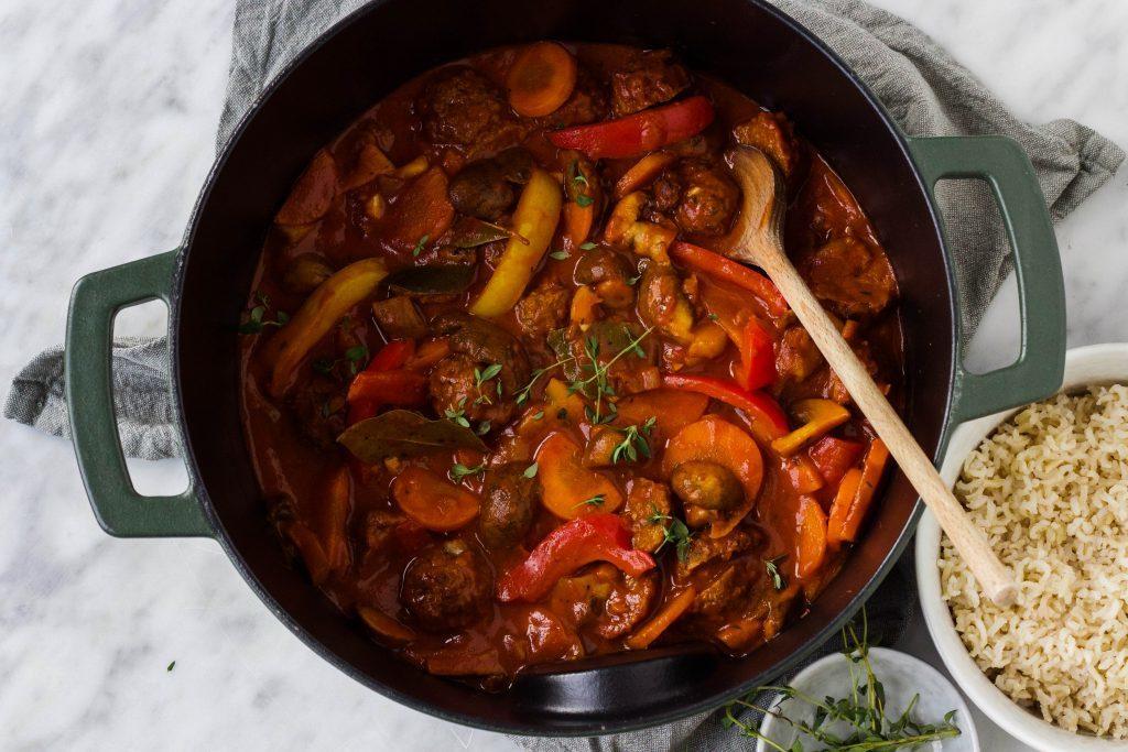 Tip: in plaats van vegetarische balletjes kun je ook seitan gebruiken voor dit gerecht. Dit is namelijk een stevige vleesvervanger dat perfect past in dese goulash.