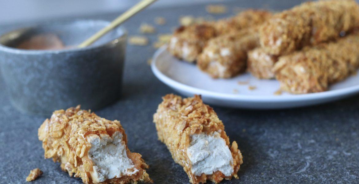 Na het succes van mijn gezonde frikandel (speciaal) is hier dan eindelijk een tweede topper van een gezonde snack! Gezonde levensstijl of niet, iedereen heeft wel eens gigantische trek in een lekkere vette hap. Ik in ieder geval wel ;) En wat als ik je nou eens vertel dat die vette hap niet eens zo ongezond hoeft te zijn? Neem bijvoorbeeld een kipcorn. Normaliter gemaakt van kip en gebakken in de frituur. Ik bekeek de achterkant van de verpakking in de winkel en zag dat er ook nog eens vijf verschillende soorten suiker in zaten. Dat kan anders dacht ik zo. Ik toverde een gezonde én vegetarische, wat zeg ik, VEGAN variant uit mijn mouw die gemaakt is van tofu. Op smaak gebracht met een lekkere marinade en omhuld in een knapperig jasje van cornflakes. Laat die frituurpan ook maar achterwege want je bakt ze in twintig minuutjes heerlijk krokant in de oven. Serveer met een pittige sriracha dip of gewoon met mayo of ketchup.