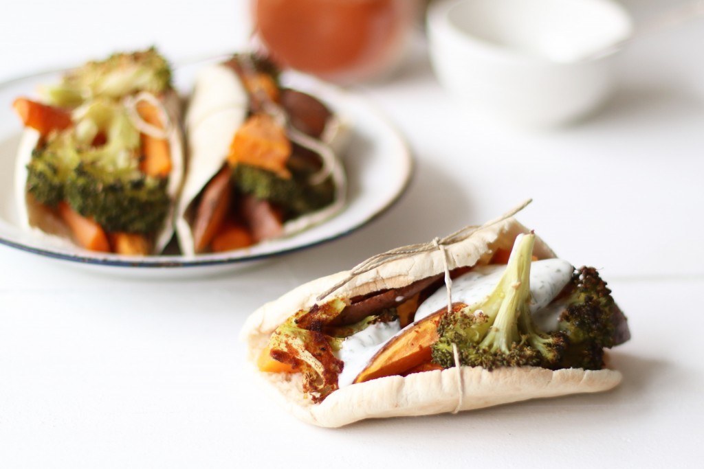 Pita broodjes zet ik niet vaak op tafel omdat de variant met gyros of shoarma en een berg knoflooksaus niet bepaald voedzaam is. Maar als we het vlees vervangen door gegrilde groenten en de knoflook saus zelf op een gezonde manier maken verandert dat de zaak! Helemaal gezond zou het zijn als je de broodjes zelf zou bakken maar ik snap dat je daar niet altijd zin in hebt na een dag hard werken. Voor iedereen die dat wel ziet zitten, heb ik hier het recept voor glutenvrije pita broodjes van Lianne. Zij blogt net als ik over gezond en lekker eten dus wip voor inspiratie ook zekers eens bij haar blog langs.