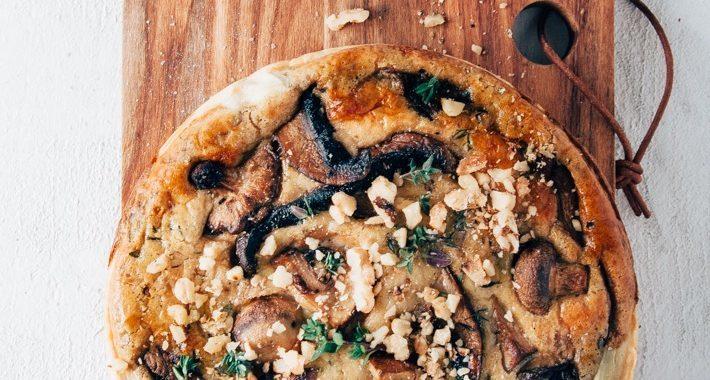De vulling bestaat uit room en eieren. Ik voeg daar een lekkere belegen kaas aan toe, wat tijm omdat dat zo perfect bij paddestoelen past en dan natuurlijk de paddestoelen zelf. Daarmee kun je het zo gek maken als je zelf wilt. Je kunt bij de super een bakje kopen met gemixte paddestoelen of ze zelf een mix maken van jouw favorieten. Op een biomarkt kun je vaak de meest prachtige soorten kopen. En wanneer je een biologische supermarkt in de buurt hebt dan is het best een goed idee om daar eens te gaan kijken wat voor mooie paddestoelen ze daar hebben. Vaak zijn ze mooier, groter en hebben ze meer soorten dan een gewone supermarkt. Het bijzondere element in deze vegetarische quiche zijn de walnoten. Die je er niet alleen overheen strooit, maar ook grof gehakt door de vulling heen mengt.