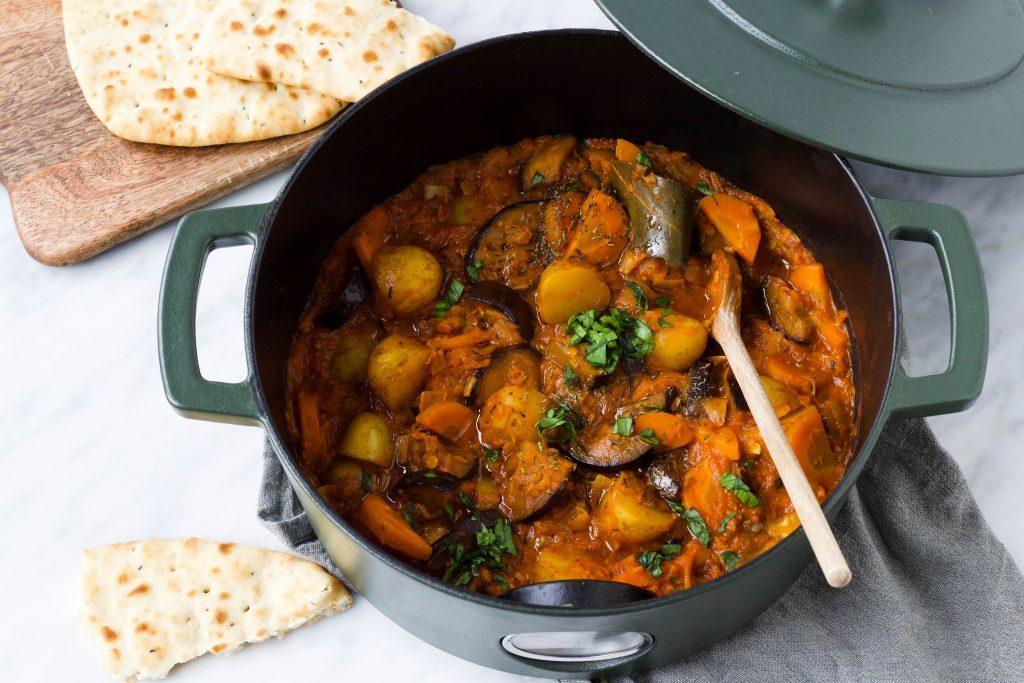 De basis van deze vegetarische stoof is bouillon, tomatenpuree, kruiden en specerijen. Dit brengt het gerecht goed op smaak en maakt ‘m heerlijk kruidig. Laat je daarom niet afschikken door de lange ingredientenlijst, want dit zijn vooral kruiden die je waarschijnlijk al in je keukenkastje hebt staan.