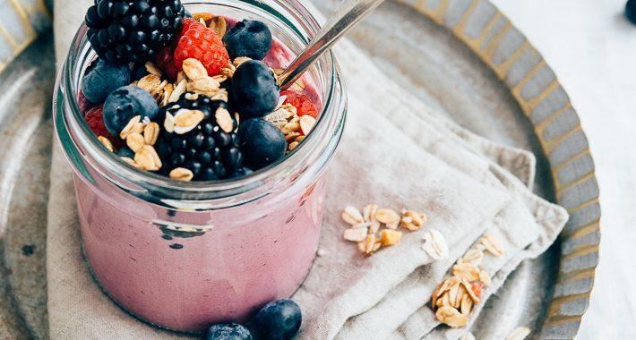 Ik maak dit ontbijtje in de PowerBlender van Philips. Dit is een enorme krachtpatser en ook echt een snelle jongen. Ik heb de blender de afgelopen maanden uitvoerig getest en ben heel enthousiast over dit apparaat. Er zit een smoothieprogramma op en met één druk op de knop blend hij in 60 seconden een lekkere smoothie voor je. Dit programma kan je ook gebruiken voor dit havermout ontbijt. Want eigenlijk is het gewoon een hele dikke smoothie met yoghurt, havermout en rood fruit. Je kan heel goed diepvriesfruit voor dit recept gebruiken. Daar heeft deze blender helemaal geen moeite mee. Geen rood fruit in huis? dit is ook heel lekker met stukjes mango, kersen of ander fruit. Voor de crunch voeg ik nog een beetje granola toe aan het einde. Dat wordt smullen achter je bureau.