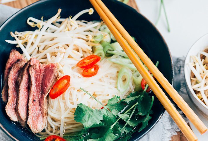 Je kan de biefstuk in hele dunne plakjes snijden en rauw toevoegen aan de soep. Toch heb ik hem eerst aangebakken. Ik heb namelijk een nieuwe inductie kookplaat: de AEG SensePro (SVI84881FB) met ingebouwde kerntemperatuursensor en die wilde ik graag uitproberen. De draadloze sensor bepaalt de kerntemperatuur tot de graad en geeft een signaal als je vlees klaar is. Dit is echt briljant. Ik heb hem ingesteld op 52 graden (rare) en mijn vlees was perfect; rood van binnen en een klein beetje bruin van buiten. Ik vind dit zo fijn. In de oven gaar ik vlees altijd al op basis van een kerntemperatuur, maar op deze manier kan je dit dus ook heel gemakkelijk in de pan doen. Ik kan heel blij worden, wanneer enigszins moeilijke dingen (zoals rood vlees bakken) toch perfect lukken.