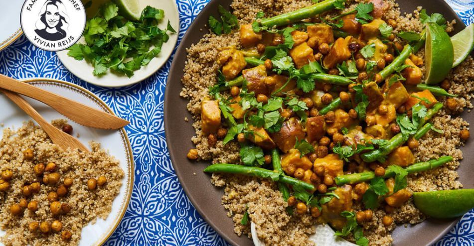 Vivian heeft een heerlijke curry gecreëerd! Je maakt zoete aardappel en sperziebonen in een rijke kokossaus. Daarbij serveer je luchtige quinoa en maakt het af met knapperig gebakken kikkererwten. Zo lekker kan gezond zijn!