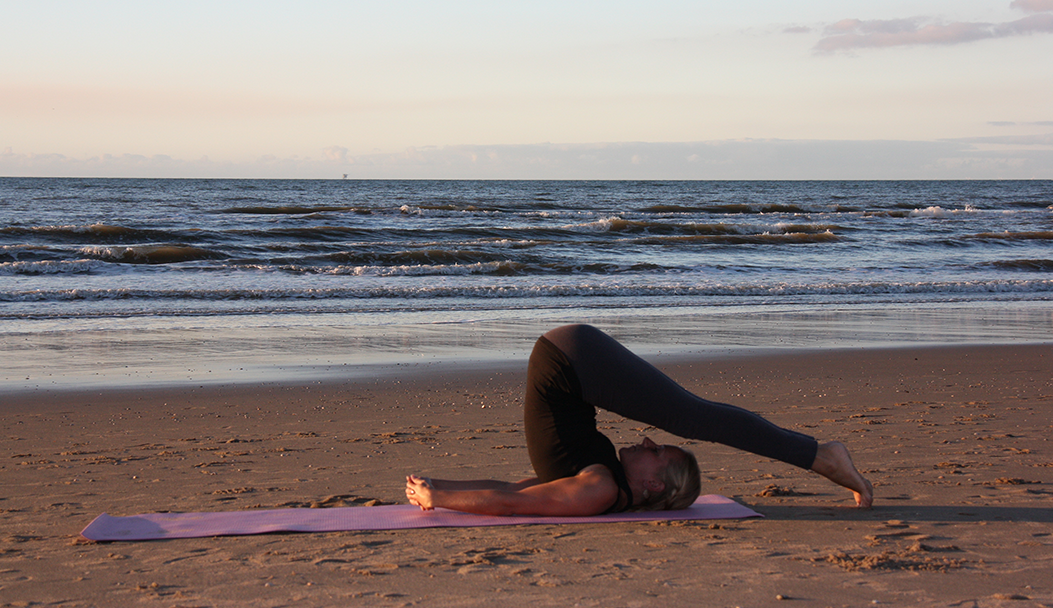 Dit is een basishouding; een omgekeerde rugligging en vooroverbuiging. In yogajargon heet deze houding “Halasana”. Hala betekent “ploeg”. Er zijn vele variaties in deze asana mogelijk, hoewel sommige behoorlijk gewaagd kunnen zijn. Het uitgangspunt is altijd doen wat goed voelt. Respecteer het lichaam en de grenzen die het aangeeft. In deze houding worden met name de dorsale (lage) rugrompspieren, hamstrings, kuitspieren, scholspier (net boven de enkel), de triceps en de monnikskapspier (schouderspier) intensief gestrekt. Strekken van het lichaam is goed omdat hierdoor de natuurlijke lengte en soepelheid van het lichaam terugkomt, de bloedbaan en stofwisseling worden gestimuleerd. Op de foto heb ik mijn handen in elkaar verstrengeld en de armen gestrekt. Als alternatief kunnen de armen ook gestrekt zijn met de handpalmen plat op de grond. Wanneer de tenen niet de grond raken en de druk op de onderrug als te veel voelt, kunnen het beste de handen op de onderrug worden gezet met de ellebogen op de grond ter ondersteuning.